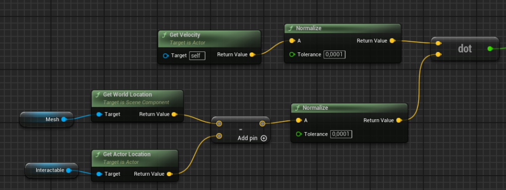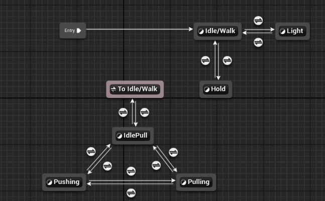 Another highlight to the animation of the player would be the 'Pulling' and 'Pushing' states, as shown in the first picture. These states need to change depending on whether the player is moving toward or away from the object they want to move. To determine the direction of movement, I use a dot product calculated from the player's movement vector, allowing the system to dynamically switch between the pulling and pushing animations based on the player's actions, like this: