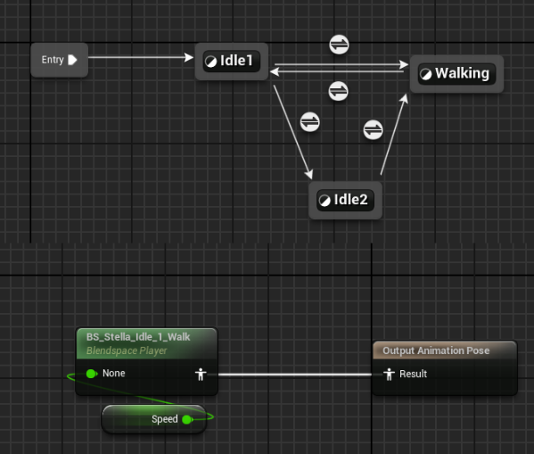 If we take a closer look at the 'Idle/Walk' state, you'll notice that I first implemented another state machine to manage the various idle animations. Additionally, there's a transition to the 'Walking' state, which is triggered based on the player's velocity—specifically, the length of the velocity vector, or speed. If the speed exceeds a certain threshold, the player transitions to walking; otherwise, they remain in the idle state. The walking animation itself is governed by this speed variable, using a blendspace to create a smooth transition. This approach not only enhances the fluidity of movement but also makes it easy to add, for example, a sprint animation at higher speeds.